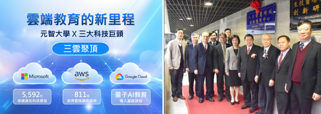除此之外,在數位化浪潮推動下,元智大學率先與全球三大雲端科技領導者——Microsoft、Google、Amazon——建立國內首創的「三雲聚頂」策略合作。由資訊學院推動 Microsoft 教育者計畫、工程學院推動 Google 雲端搖籃計畫、電通學院推動 AWS 雲創學院計畫,並陸續邀請其他院系跨域參與,共同打造前瞻、開放的智慧學習環境。